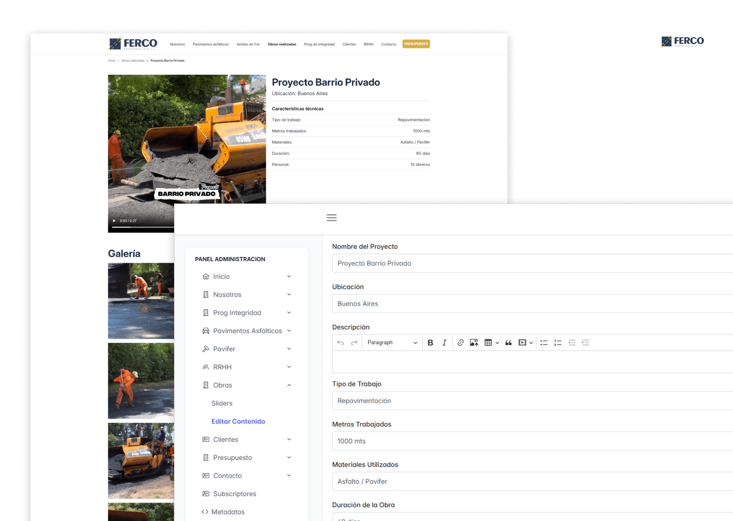Desarrollar un sitio web institucional sólido y funcional que represente la trayectoria de FERCO S.A., facilite la comunicación de sus servicios y permita al equipo gestionar y actualizar contenidos de forma autónoma. | La empresa necesitaba una presencia digital clara y actualizada que reflejara su experiencia técnica y procesos reales, sin depender de terceros para la gestión diaria del contenido ni perder coherencia visual. | Diseño y desarrollo de un sitio web con CRM administrable, acompañado por producción de contenido visual propio (fotografía y video en obra), integrando diseño UX/UI, gestión del proyecto y registro audiovisual para comunicar el proceso completo del pavimento asfáltico de manera clara y profesional. |
