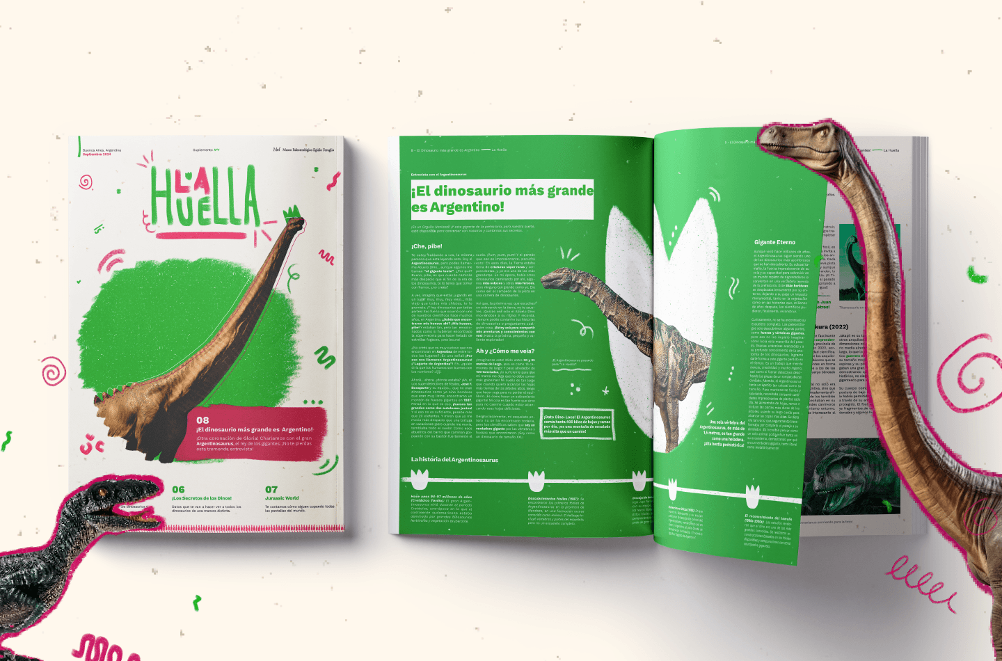 La Huella es un suplemento educativo sobre dinosaurios patagónicos, hecho para la materia de Editorial I. Busca despertar el interés de los más jóvenes por la paleontología con juegos, ilustraciones y explicaciones simples.