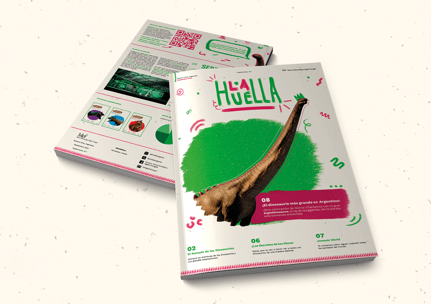 La Huella es un proyecto de la facultad para la materia de Editorial I. Está basado en el Museo de Evolución de la Fauna (MEF), que cuenta la historia de los dinosaurios en la Patagonia, desde su evolución hasta su extinción. Con este suplemento, queremos despertar el interés por la paleontología en los más jóvenes, usando imágenes, juegos y explicaciones fáciles para fomentar su curiosidad y creatividad.